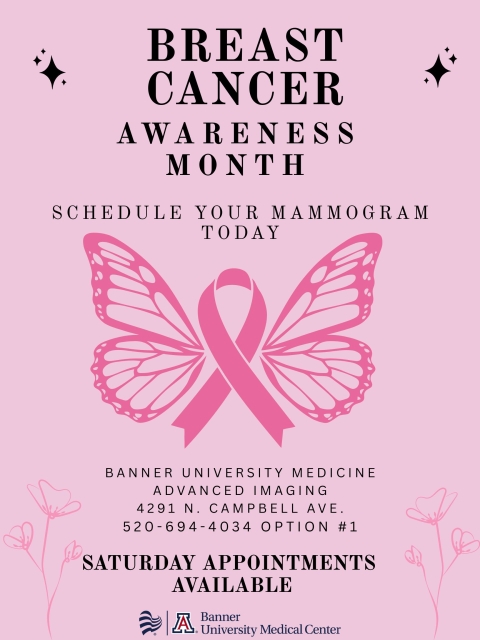 October is Breast Cancer Awareness Month which serves as a powerful reminder that early detection saves lives. Scheduling your mammogram is a simple step that can make all the difference. Contact the expert team at Banner University Medicine Advanced Imaging 520 - 694 - 4034, option #1. Saturday appointments are available.
